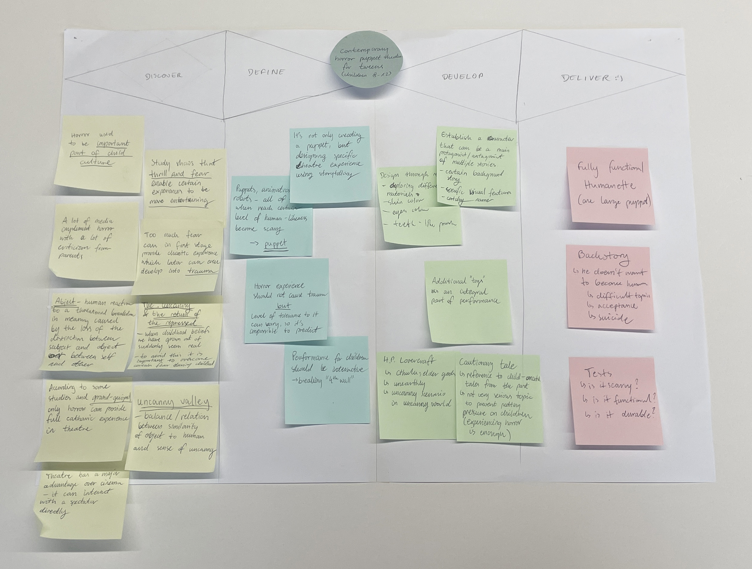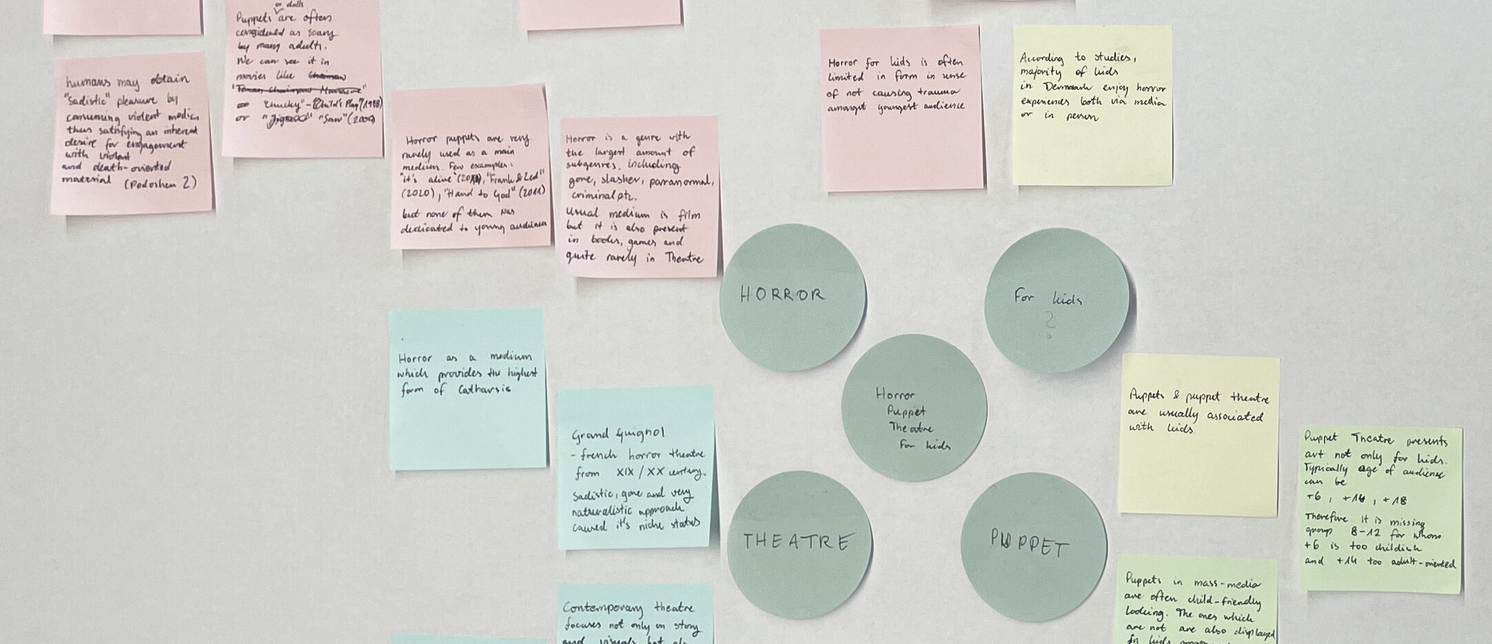 During the research, I found out that theatre is one of the strongest media for horror. It allows for direct interaction with the viewer and makes the experience feel more real. Additionally, puppet theatre is good to discuss more difficult topics due to its more indirect approach.